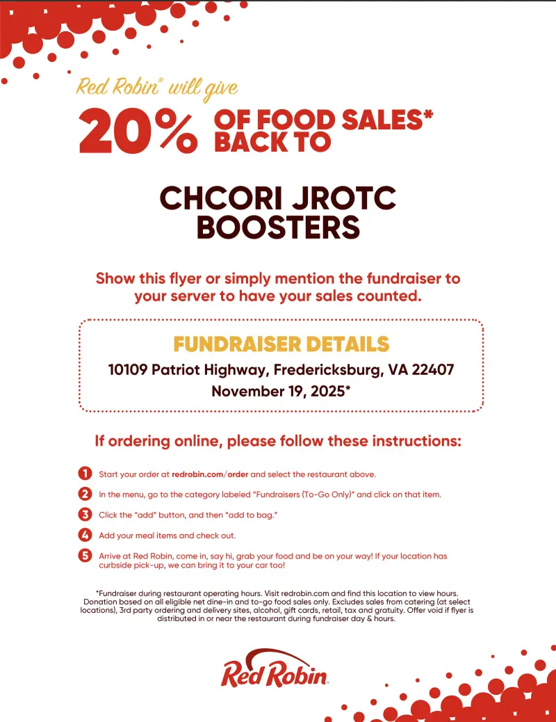 Join us on Wednesday, November 19, 2025, at Red Robin (10109 Patriot Highway, Fredericksburg, VA) and help support the CHCORI Army JROTC Boosters!