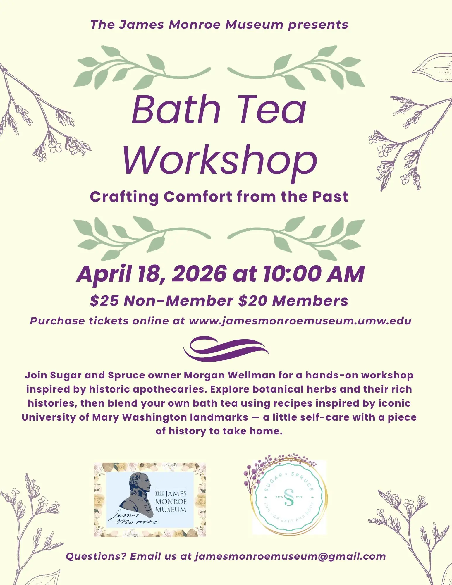 Join us and Sugar and Spruce’s owner Morgan Wellman for a hands-on workshop inspired by historic apothecaries. Explore botanical herbs and their rich histories, then blend your own bath tea using recipes inspired by iconic University of Mary Washington landmarks, a little self-care with a piece of history to take home.