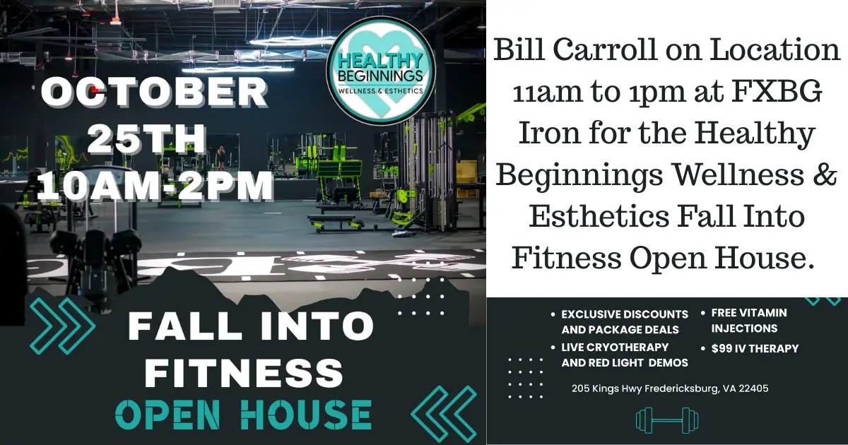 Join Bill Carroll for Healthy Beginnings Wellness & Esthetics’ Fall Into Fitness Open House at their Recovery Room inside FXBG Iron Gym, located at 205 Kings Highway in Fredericksburg! Enjoy discounts, live cryotherapy, and red light demos, free vitamin injections, and more! The Open House runs 10 to 2p—see you there!