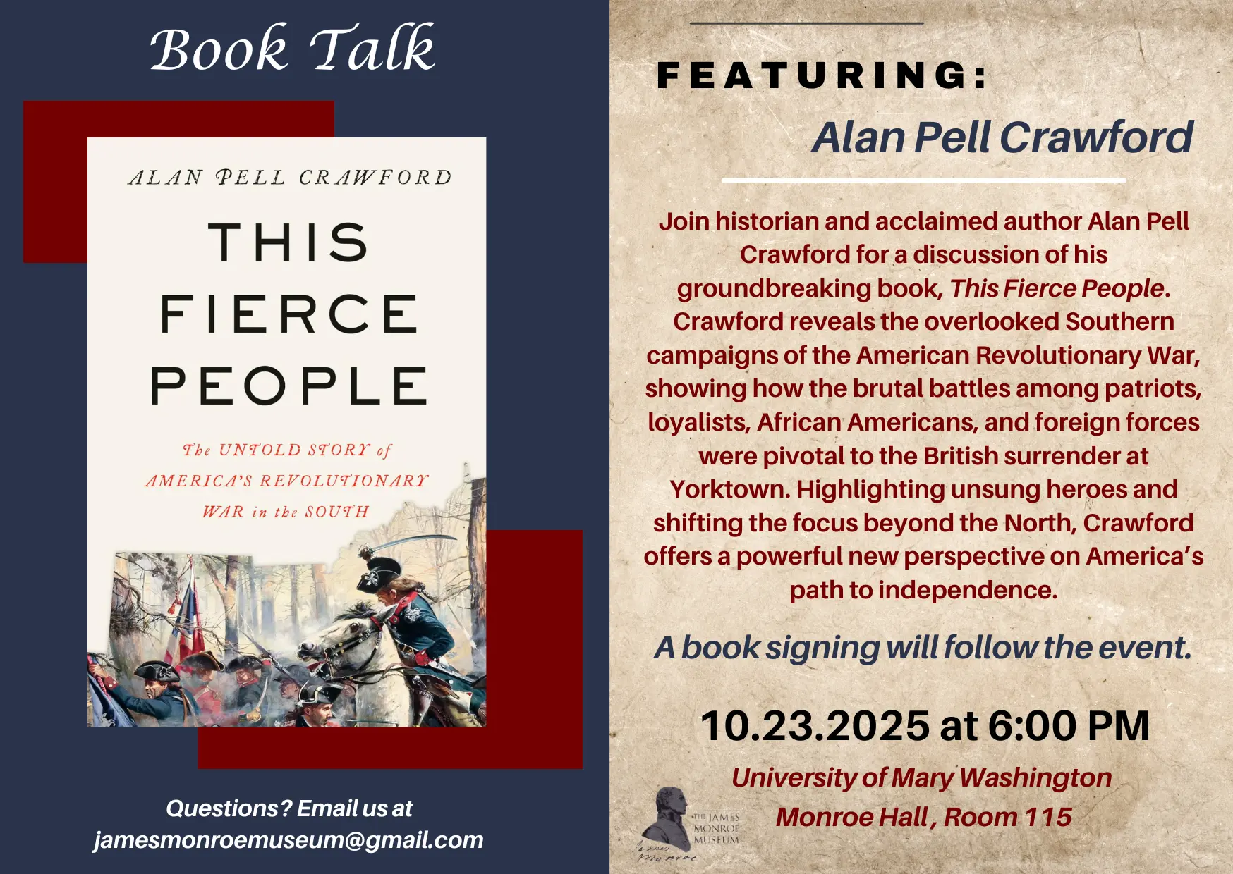 Join historian and acclaimed author Alan Pell Crawford on October 23, 2025, at 6:00 PM at the University of Mary Washington (Monroe Hall- Room 115) for a compelling discussion of his groundbreaking book, This Fierce People.