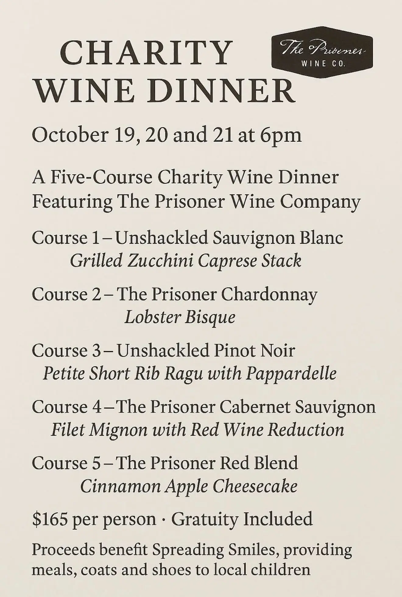 5 Course Wine Dinner Featuring Prisoner Wine Company. Each ticket provides a local child with a pair of shoes, coat and a month of weekend meal bags. There are 3 dates to choose from— 10/19, 10/20 and 10/21. 6pm on our outside patio.