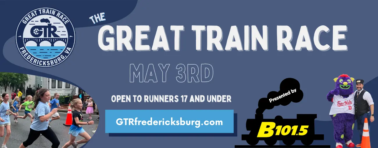 The Great Train Race will return to downtown Fredericksburg, VA on May 3rd 2026! This is one of the largest timed kid’s races on the east coast. Young runners get the rare opportunity to compete in a race just for them.