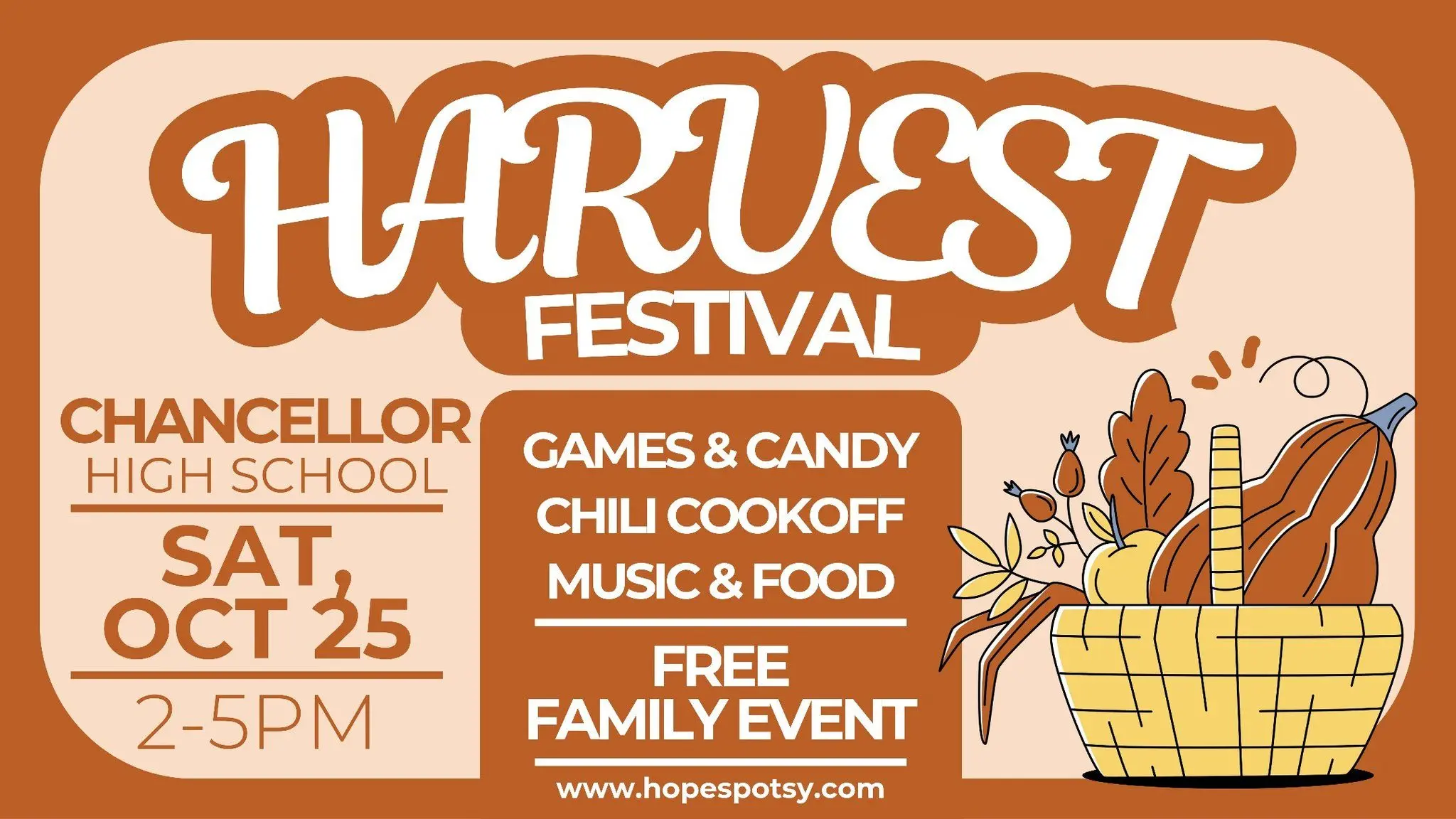 Join us for the Harvest Festival at Chancellor High School on Saturday, Oct 25, 2–5 PM. It’s a free family event with games and candy, a chili cookoff, music, and plenty of food. Bring the kids, invite your neighbors, and celebrate fall with the community. More info: hopespotsy.com