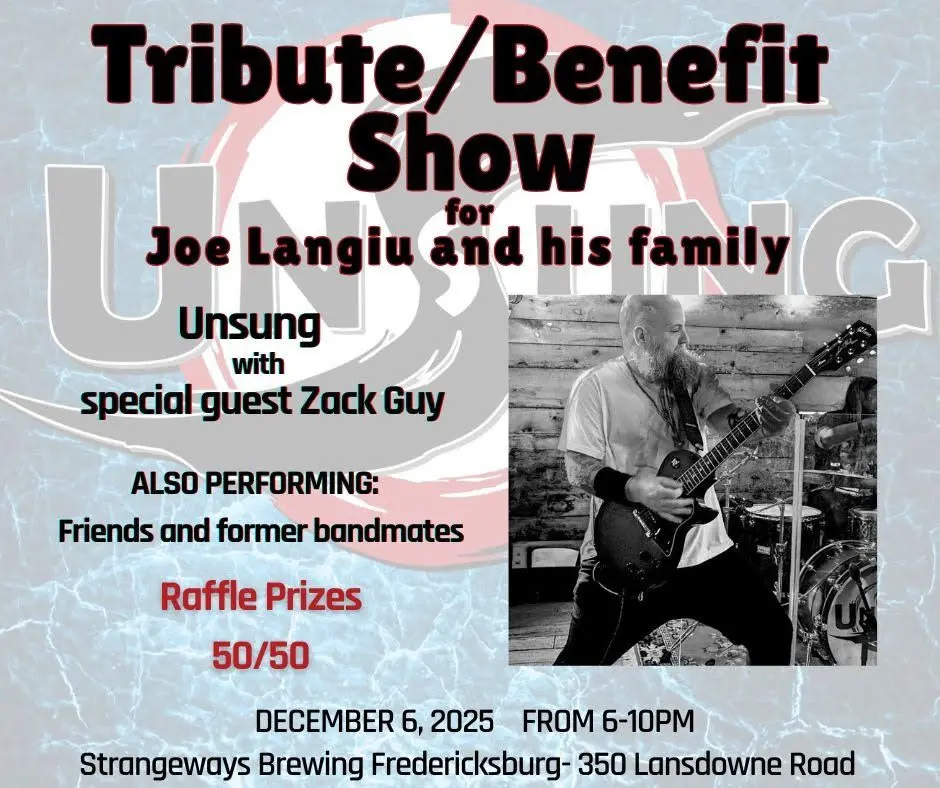The bandmates of Unsung are hosting a benefit dedicated to the Langiu family, donating all the proceeds from the show to help them. The community is invited to join them at Strangeways Brewing in Fredericksburg from 6 p.m. to 11 p.m. on Saturday, December 6.