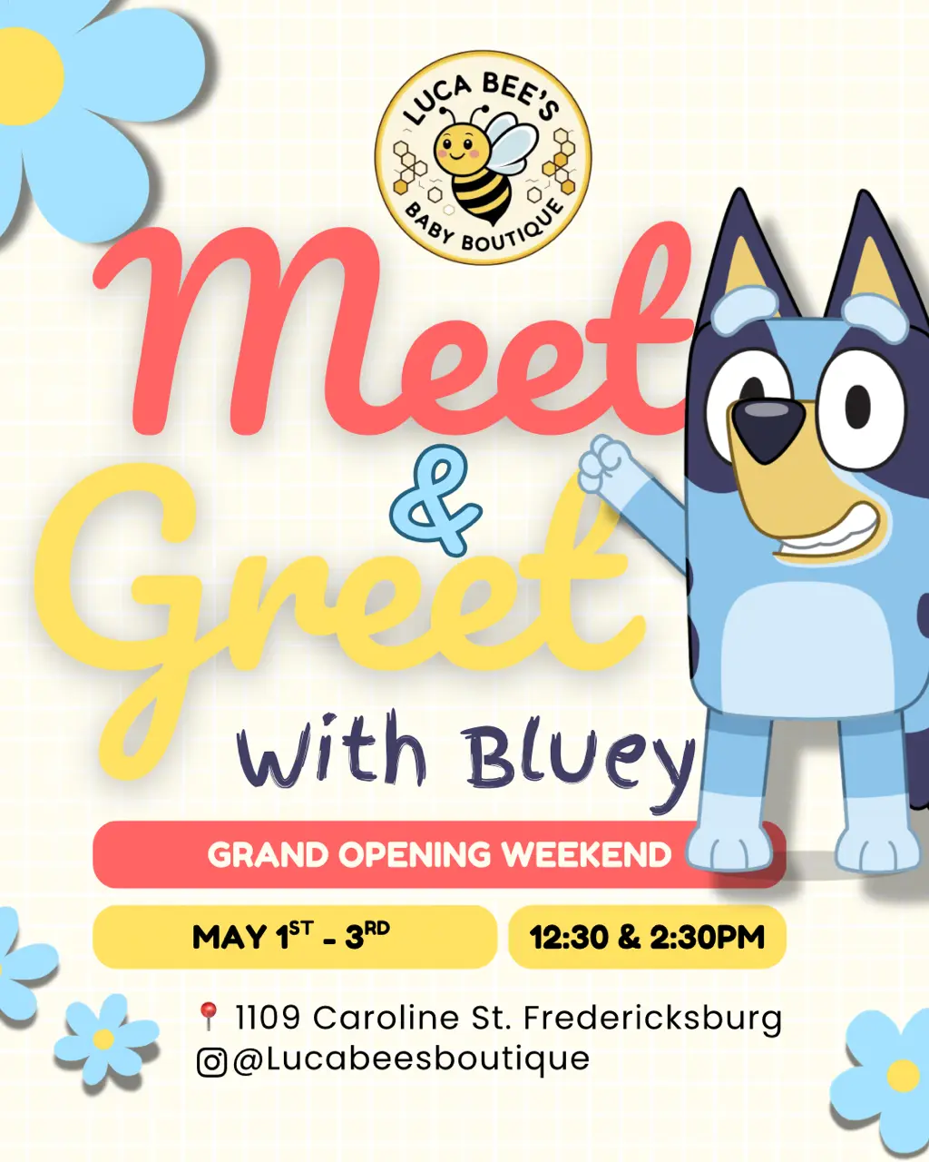 Catch Bluey at 12:30 PM & 2:30 PMÂ for hugs, pics, and a full-on dance party.