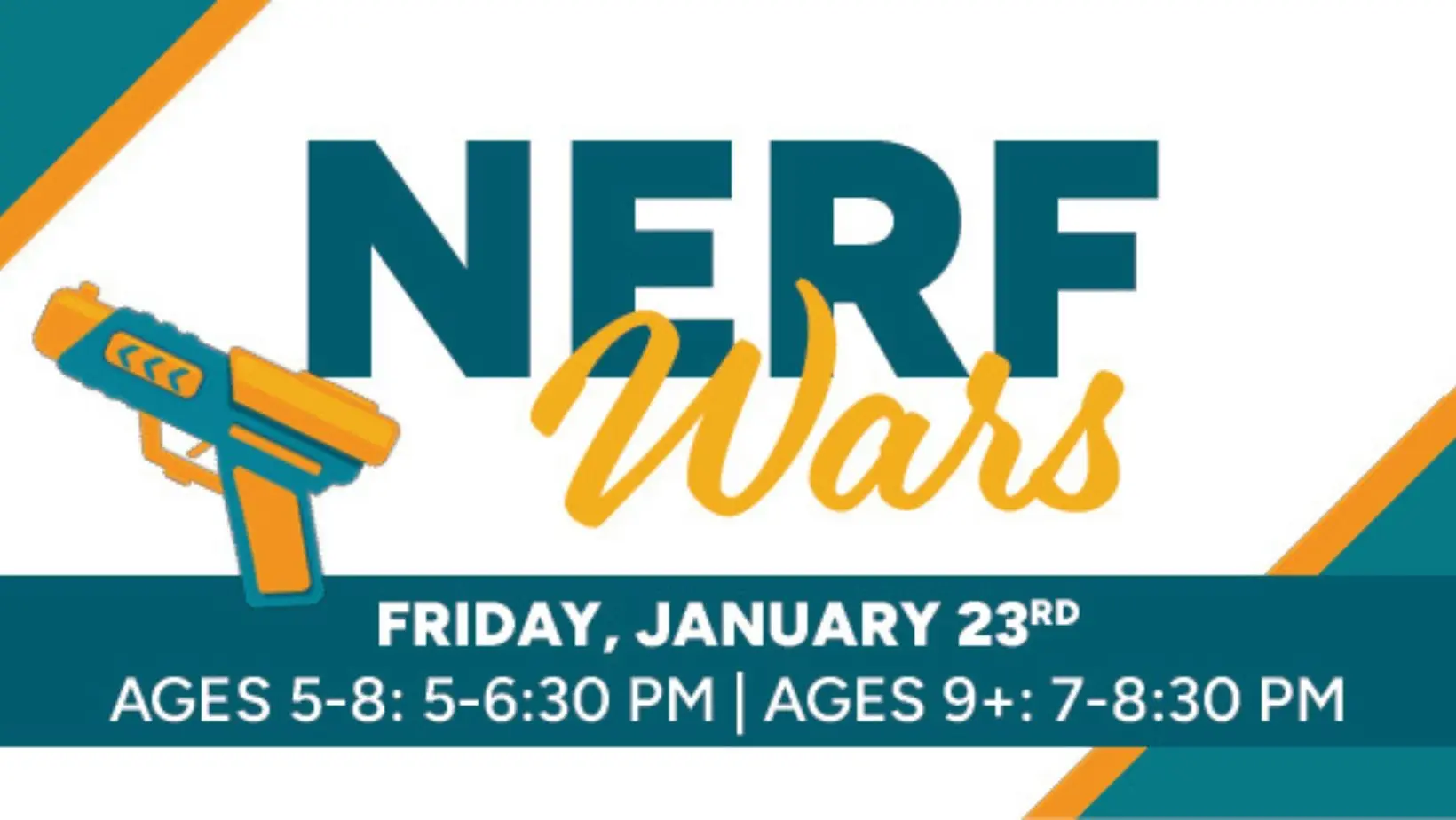 We’ll provide the darts and safety eyewear. Bring your favorite Nerf blaster clearly labeled with your name.