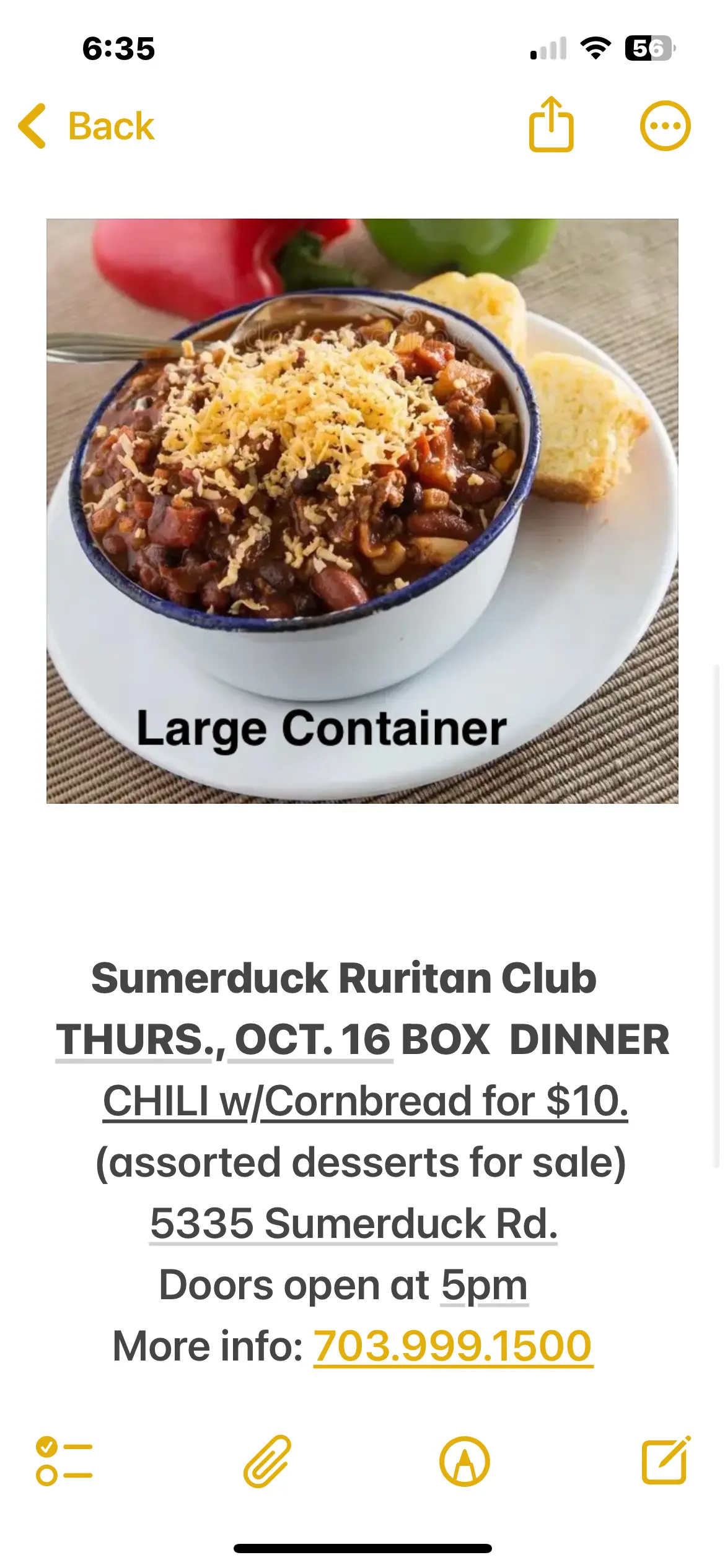 Please join us for a large bowl of Chili and Corn Bread for $ 10 and assorted desserts for $2. Sumerduck Ruritan Club 5335 Sumerduck Rd Sumerduck, VA 22742. Doors open at 5pm until sold out on Thursday 10/16/25. All proceeds go to our community needs.