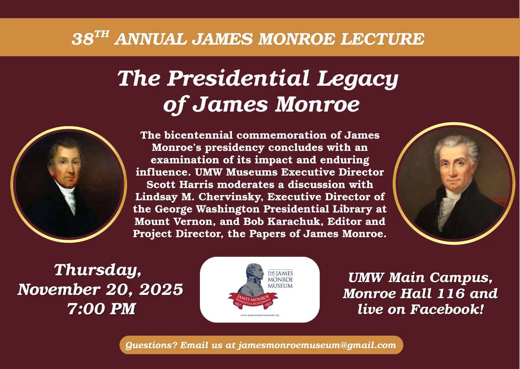 The bicentennial commemoration of James Monroe’s presidency concludes with an examination of its impact and enduring influence. UMW Museums Executive Director Scott Harris moderates a discussion with Lindsay M. Chervinsky, Executive Director of the George Washington Presidential Library at Mount Vernon, and Bob Karachuk, Editor and Project Director, the Papers of James Monroe.