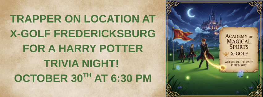 Join Trapper on Thursday, October 30th, at 6:30 for Harry Potter Trivia night at X-Golf! Located in The Village behind Spotsylvania Towne Centre. Register at https://xgolf-fredericksburg.com/.