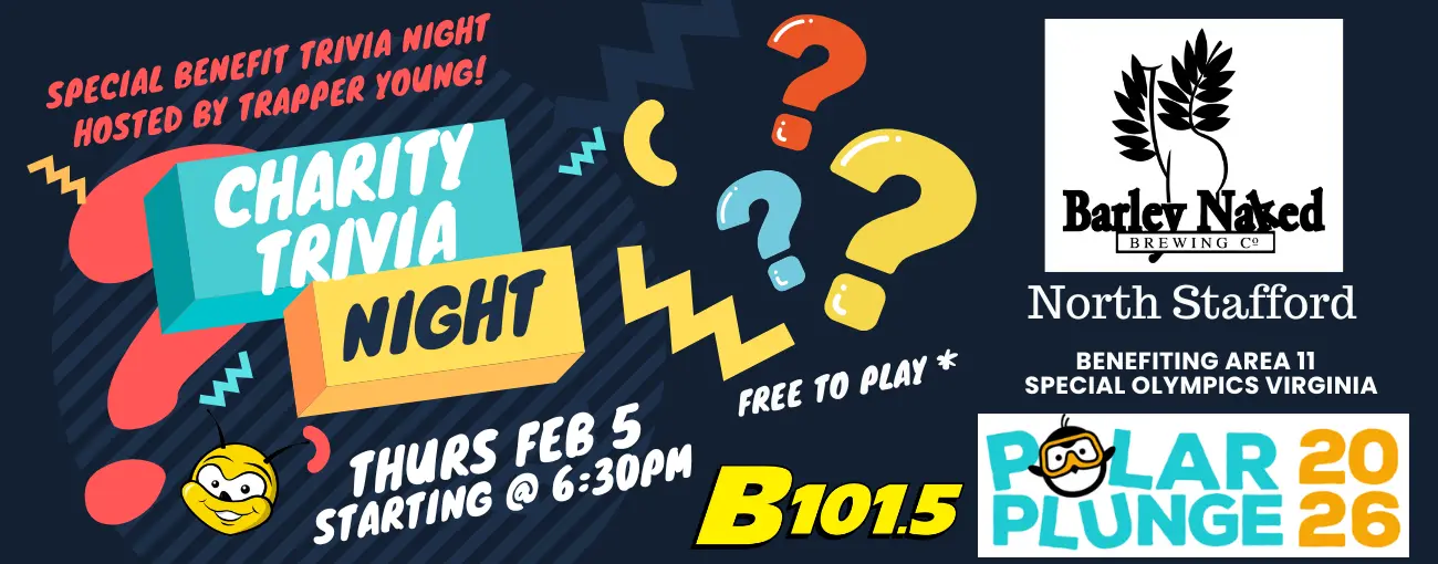 Thursday night, February 5th, starting at 6:30, join Trapper Young and Ted Schubel at Barley Naked Brewing near the intersection of Garrisonville and Furnace Roads in Stafford for a special night of trivia — all for a great cause!