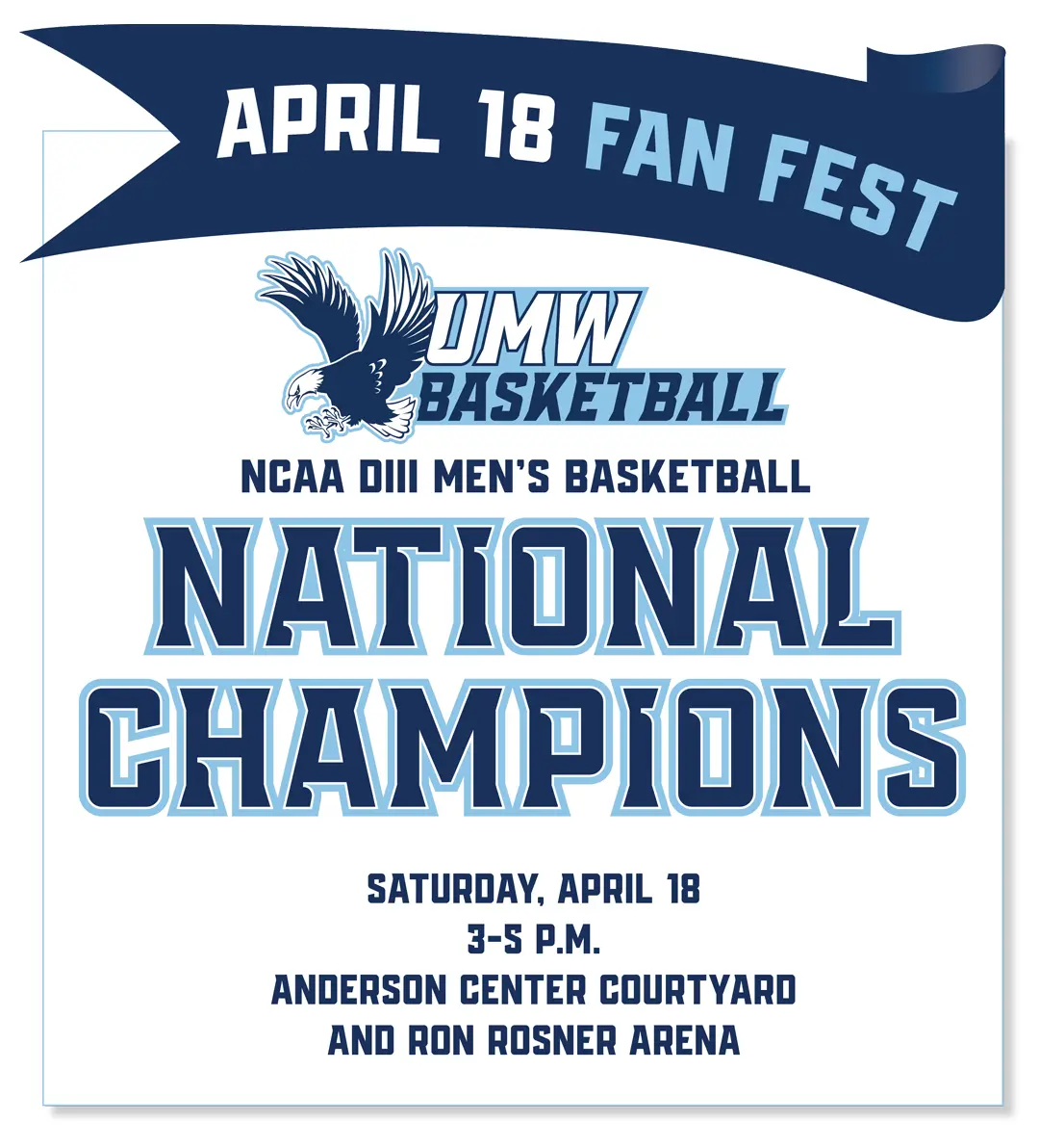 Celebrate the 2026 NCAA DIII Men’s Basketball National Champions with Fan Fest on the Fredericksburg Campus, Saturday, April 18, from 3–5 p.m. in the Anderson Center. We’ll have fan activities, food trucks around the courtyard, and limited–edition championship items. This city-wide celebration includes a team trolley that will travel downtown prior to the event, so you can also watch the motorcade and wave to the team between 2:30–3:15 p.m. on April 18. Look for the rolling parade route on social media and follow along @marywash, @marywashadmissions, @umwathletics and @umw_mensbasketball, and then join us on campus from 3–5 p.m. to meet the team. You are also invited to make posters at the Fredericksburg Visitor Center (free) on Friday, April 17 and Saturday, April 18 so you’re ready to show your spirit when the motorcade passes by! UMW’s National Championship Fan Fest is open to the community with public parking available in the Alvey Deck and across Rt. 1 in Eagle Village. Food trucks and concessions will be available to purchase; specials will be available for UMW students and Destination UMW visitors that day. Thanks for cheering on the hometown team during this historic season!