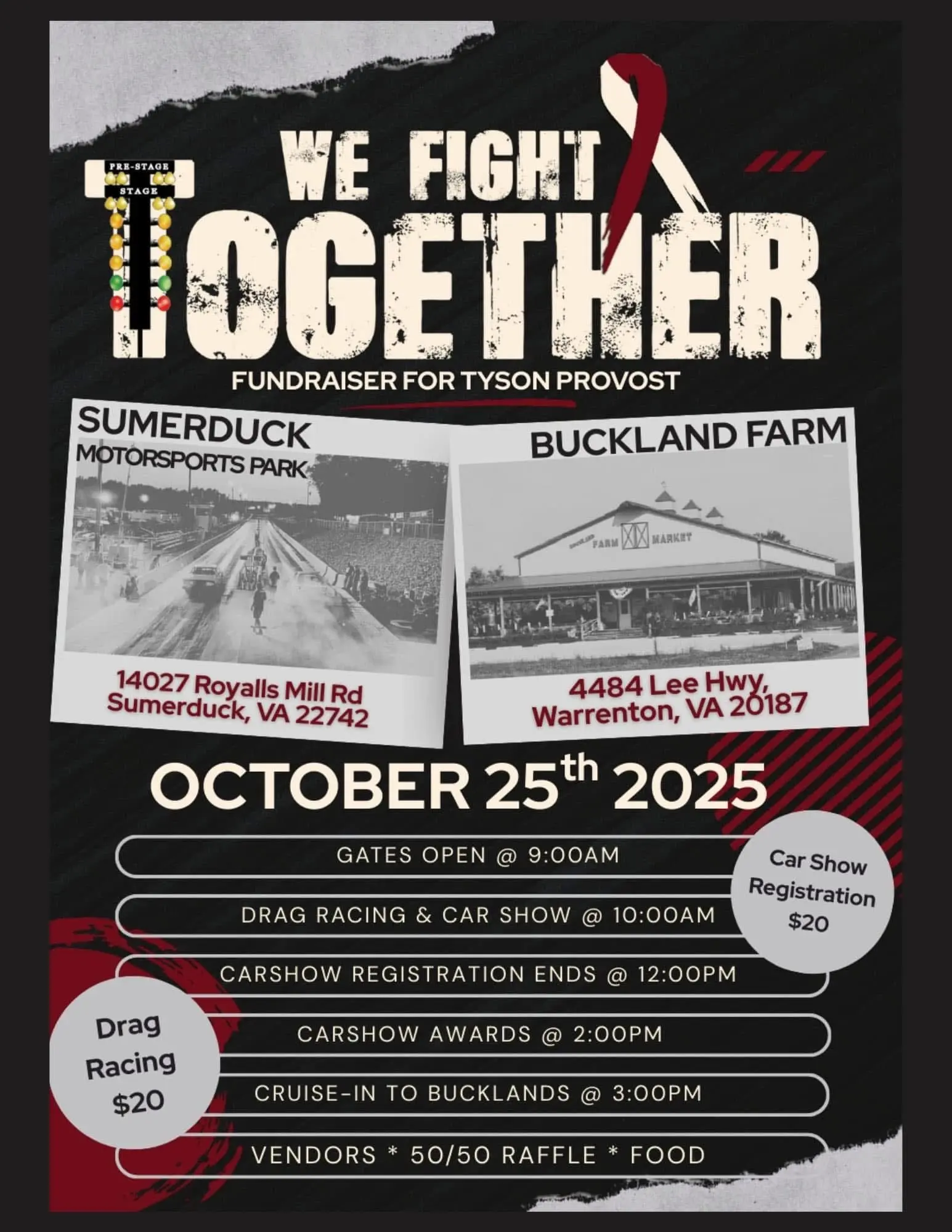 Fundraiser for Tyson Provost who has been diagnosed with stage 3 throat cancer and is no longer able to work. He’s going thru treantments and the expenses are a bit overwhelming. Come out and help us fight cancer and enjoy some amazing cars, racing and company and raise money for a great guy that would give and has given the shirt off his back so many times.