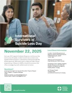 International Survivors of Suicide Loss Day is an event in which survivors of suicide loss come together to find connection, understanding, and hope through their shared experience. This year, International Survivors of Suicide Loss Day is Saturday, November 22, 2025. For more information and to register visit: https://fredericksburg-virginia.isosld.afsp.org/