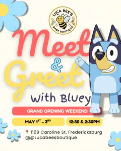 Find out more »š Grand Opening: ⨠First 50 customers score FREE giftsĀ (run, donāt walk) šļø Major opening weekend dealsĀ youāll definitely want to brag about Ribbon Cutting – May 1st @ 12 Noon š Bluey Meet & GreetĀ š Catch Bluey at 12:30 PM & 2:30 PMĀ for hugs, pics, and a full-on dance party. š 1109 Caroline St, Downtown Fredericksburg Bring the kids, bring the grandparents, bring your wallet (youāve been warned š)⦠and come meet your new favorite childrenās boutique for the best…