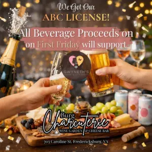 WE GOT OUR ABC LICENSE!!! Our license officially kicks in next week… but First Friday on 3/6  gets a sneak peek. Join us this Friday for a preview of what we offer as we celebrate Downtown Fredericksburg First Friday. Even better — ALL beverage proceeds will go to Gwyneth’s Gift Foundation. They train our community in Hands-Only CPR and place AEDs in businesses and public spaces — helping save lives when seconds matter. So come sip, snack, and help us…