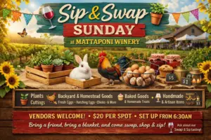 Sip & Swap Sunday at Mattaponi Winery We’re turning Sundays into a good old-fashioned backyard-style swap & market—and you’re invited! Kick off date, Sunday April 12th and will run select Sundays through September 20th Come hang out, sip some wine, and see what treasures everyone brings. You never know what you’ll find Plants & cuttings Backyard & homestead goods (fresh eggs, hatching eggs, chicks, bunnies etc.) Baked goods & homemade treats Handmade & artisan items Yard sale & vintage finds…