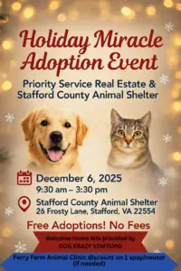 Priority Service Real Estate & Stafford County Animal Shelter are teaming up for a Free Pet Adoption Event! No Adoption Fees.