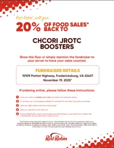 Join us on Wednesday, November 19, 2025, at Red Robin (10109 Patriot Highway, Fredericksburg, VA) and help support the CHCORI Army JROTC Boosters! ✨ 20% of all eligible food sales will be donated back to our Booster Club β€” just show this flyer or mention CHCORI JROTC when you order! πŸ“± Ordering To-Go? Follow these easy steps: 1️⃣ Go to redrobin.com/order 2️⃣ Choose the Fredericksburg location listed above 3️⃣ Click β€œFundraisers (To-Go Only)” and add it to your bag 4️⃣…