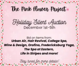 The Pink Flower Project is a 501(c)3 nonprofit organization dedicated to providing feminine hygiene products to local area schools in the form of individual bags, each stuffed with pads, liners, and sanitary wipes. We currently serve Spotsylvania, Fredericksburg, King George, Stafford, Caroline, and Orange counties. We are hosting an online silent auction to raise funds to assist us with our mission. We currently have donations from Wine and Design, Urban Air, Fredericksburg Yoga, and more! Participants will be able to…