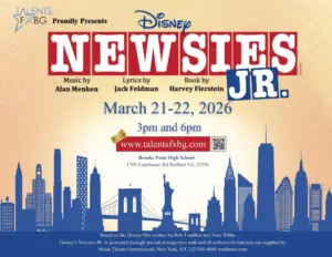 Grab your newsies caps and carry the banner to Talents FXBG’s production for Disney’s Newsies JR.! Set in the bustling streets of New York City, this high-energy musical follows Jack Kelly and a fearless group of young newsies who stand up to powerful publishers and fight for what’s right. Packed with thrilling choreography, big heart, and show-stopping songs like “Carrying the Banner,” “Seize the Day,” and “King of New York,” Newsies JR. is an unforgettable, family-friendly experience for all ages.…