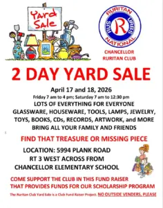 The Chancellor Ruritan Club Spring Garage/Yard Sale is Friday, April 17 from 7am-4pm and Saturday, April 18, 7am-12:30pm. We have household goods, furniture, tools, toys, woodworking equipment, bicycles, appliances, garage & lawn equipment, and more. The money raised goes to our scholarship fund and helps support other projects we do in the community. So, come on out to the Chancellor Ruritan Club at 5994 Plank Road and support us. The event is both inside & canopied outside, so rain is…