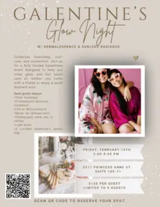 Join us for Galentine’s Glow Night — an intimate, fully hosted evening of skincare, spray tans, champagne, and connection with Dermalessence & Sunless Radiance . From chair massages to professional LED or microcurrent treatments, this night is all about feeling pampered, confident, and radiant from head to toe. 📍 Spots are very limited (only 8 guests) 📅 Friday, February 13 | 3–8 PM 📍 2217 Princess Anne St, Suite 105-11 💵 $135 per guest