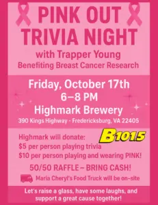 Join Trapper Young for a night of Trivia all while raising funds for Breast Cancer Research! Prizes for 1st , 2nd and 3rd place teams. 🎀 PINK OUT TRIVIA NIGHT 🎀with Trapper YoungBenefiting Breast Cancer Research đź“… Friday, October 17thđź•• 6–8 PM📍 Highmark Brewery390 Kings Highway • Fredericksburg, VA 22405 đź’— Highmark will donate:👉 $5 per person playing trivia👉 $10 per person playing and wearing PINK! đź’° 50/50 Raffle – Bring Cash!🍔 Maria Cheryl’s Food Truck will be on-site serving…