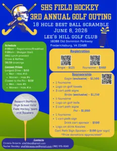 Join us for the 3rd Annual Stafford High School Field Hockey Outing on June 8, 2026 at Lee’s Hill Golf Club. The golf outing proceeds benefit purchase of new equipment, team camp costs, specialized training, post-season costs and travel expenses this September to a two day invitation only tournament in PA for nationally ranked high school teams. We are seeking corporate sponsors as well as donations for door prizes, raffles, and awards. No donation is too small, and each sponsor…