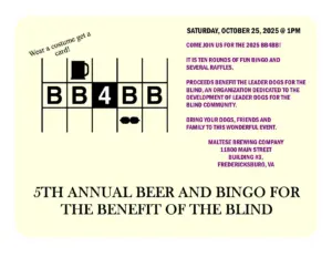 Come join us for the 5th BB4BB! It is ten rounds of fun bingo and several raffles. Proceeds benefit the Leader Dogs for the Blind, an organization dedicated to the development of leader dogs for the blind community. Bring your dogs, friends and family to this wonderful event. Registration starts at 1PM. First round of bingo starts at 2PM.