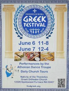 Find out more »The Fredericksburg Greek Festival FOOD & FUN FOR THE WHOLE FAMILY! Be Greek for a day! For more than 30 years, the annual Fredericksburg Greek Festival has drawn huge crowds who enjoy delicious, authentic Greek food favorites, lively music, and celebration. We welcome everyone in the Fredericksburg community to join our Greek family and learn more about our food, culture, and history! We serve a wide variety of Greek food, Greek beer and wine, and soft drinks. Performances by the Athenian Danse Troupe…