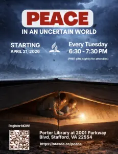 Find out more »Discover true peace in an uncertain world. In this powerful Bible study series at Porter Library in Stafford, VA, beginning on April 21, we explore practical strategies to find calm and clarity amid chaos and unpredictability. 👉 Ready to reclaim your peace? Hit this link, https://stasda.cc/peace, to register and share this video with anyone struggling to find peace right now — let’s spread calm together!