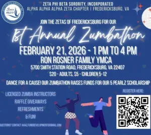 The Alpha Alpha Alpha Zeta (AAAZ) Chapter of Zeta Phi Beta Sorority, Inc. of Fredericksburg, VA is thrilled to host our 1st Annual Zumbathon fundraiser! Enhance your New Year fitness goals with an afternoon of high-energy Zumba, raffles, fun and pure community joy, all in support of our 5 Pearlz Scholarship! Let’s shine, smile and step into 2026, feeling strong and inspired! Bring a friend (or two), your energy and let’s dance for a great cause! Please register at the…