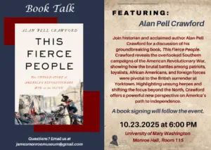 Join historian and acclaimed author Alan Pell Crawford on October 23, 2025, at 6:00 PM at the University of Mary Washington (Monroe Hall- Room 115) for a compelling discussion of his groundbreaking book, This Fierce People. In this riveting work, Crawford reveals the overlooked Southern campaigns of the American Revolutionary War, showing how the fierce battles fought between patriots, loyalists, African Americans, and foreign forces in the South were pivotal to the eventual British surrender at Yorktown. Far from being…